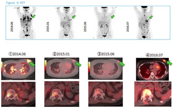 李阿姨確診后拒絕了化療和內(nèi)分泌治療,覺得太痛苦。之后嘗試免疫細(xì)胞治療。在2014年6月開始αβT細(xì)胞,之后追加DC疫苗治療2年+,經(jīng)IHC檢查使用了人工抗原MUC1、HER2、WT1。期間斷斷續(xù)續(xù)使用過幾次較短時(shí)間的內(nèi)分泌藥物。直到2016年8月發(fā)布該個(gè)案論文時(shí),患者仍然生存。