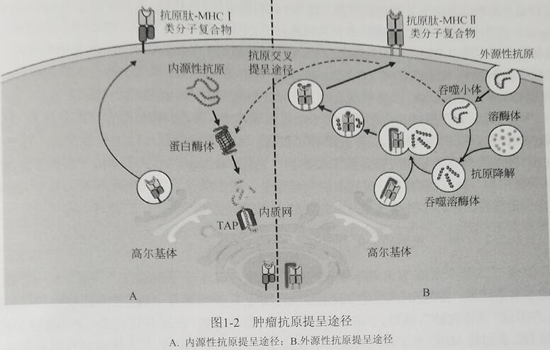 理論上,腫瘤抗原的加工和提呈可分為“內源性”和“外源性”兩種途徑。內源性抗原呈途徑即腫瘤細胞自身作為APC,胞內的內源性腫瘤抗原再蛋白酶體的作用下降解為能夠被識別的肽段,在內質網與已合成的MHC I類分子結合形成“抗原肽-MHC I類分子 復合物”,隨后轉移至細胞表面供CD8+T細胞的TCR識別(圖1-2A)。外源性抗原提呈途徑即由APC攝取外源性腫瘤抗原,經溶酶體降解為可被識別的肽段,在內質網與已合成 的MHC II類分子結合形成“抗原肽-MHC II類分子復合物”,隨后轉移至細胞表面供CD4+T細胞的TCR識別(圖1-2B)。由于腫瘤細胞往往具有抗原提呈機制的缺陷,如MHC I類 分子下調和缺失、抗原加工相關轉云體(transporter associated with antigen processing,TAP) 相關基因突變,而且在疾病早期階段,腫瘤細胞自身的遷移(即轉移)有限,所以在腫瘤免疫激活的早期階段,初始CD4+和CD8+T細胞的活化主要依靠APC在引流淋巴結部位的外源性腫瘤抗原提呈。DC在上述過程中發揮至關重要的作用,一方面DC是已知功能最強的APC,也是唯一能夠激活初始T細跑的APC;另一方面,疾病早期階段腫瘤細胞自身的遷移有限,而在局部引流淋巴結轉移尚為陰性時,腫瘤原發灶往往已經有明顯的DC浸潤。DC同時表達MHC I和MHC II類分子,使其既能通過內源性途徑向CD8+T細胞、也能通過外源性途徑向CD4+T細胞提呈抗原。另外,DC攝取的外源性抗原,也可由蛋白酶體降解,經TAP進入內質網與MHC I類分子結合,從而被CD8+T細胞識別。這種外源性抗原循MHC I類分子途徑提呈給CD8+T細胞的非經典途徑稱為“抗原交叉提呈途徑”(圖1-2)。