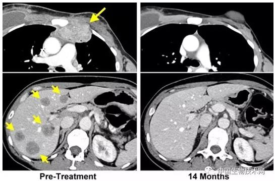 通過免疫細胞進行改造來直接瞄準腫瘤形成的T細胞療法是目前癌癥治療中最令人興奮的進展之一。在這種方法中,T細胞從病人體內取出,并在體外進行改造,使T細胞表達表面嵌合抗原受體,當細胞被轉移回體內時,抗原受體會像"汽車"一樣,直接把T細胞 "運載"到病人的腫瘤上。這種方法成功治愈乳腺癌根據本周《自然-醫學》在線發表的一篇論文,一位患者的免疫系統經過調整后完全消除了乳腺癌細胞,為所有常規治療無效的晚期癌癥提供了一種可能的治療方法。這是T細胞免疫療法首次成功應用于晚期乳腺癌。