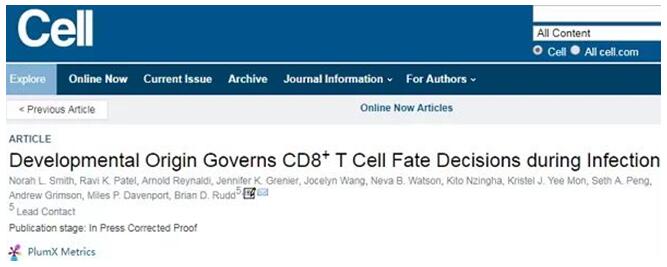 康奈爾大學Veterinary醫學院的免疫學教授Brian Rudd帶領團隊發現,成年人體內存在初始免疫細胞(fetal immune cells),而且其會在對抗感染過程中發揮特殊作用,這類在生命初期就產生的CD8+ T細胞會在成年期快速應對入侵者。