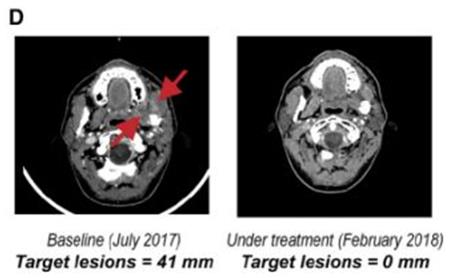 科學(xué)家們還進(jìn)行了臨床試驗(yàn),他們篩選了31名鱗狀細(xì)胞頭頸癌患者,對其進(jìn)行了分組,分別使用了不同劑量的NKG2A單抗以及EGFR受體抑制劑cetuximab。最終這31名患者中,8名患者有超過30%的腫瘤減少,14名患者病灶減少50%,病情得到有效緩解,甚至一名患者病灶完全消失了!