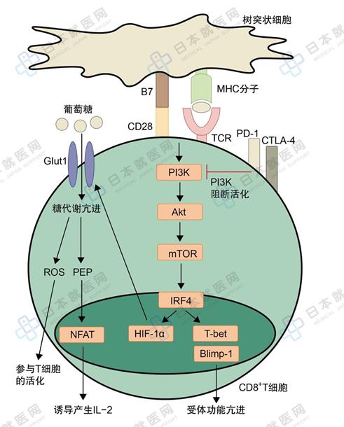 T細胞在樹突狀細胞的抗原刺激下被激活,在mTOR等多重因素作用下,葡萄糖代謝亢進。糖代謝的亢進可以增強T細胞的活性、促進其分化和增殖。但是PD-1、CTLA-4可以干擾糖代謝,使糖代謝功能降低。實際上使用抗PD-1抗體藥物后,可以增強糖代謝的亢進,糖代謝的產物進一步有維持T細胞活性的作用(圖)。反之,阻斷ROS路徑卻降低了CTL的數量。