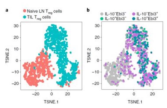 在此次的研究中,研究員DeepaliSawant博士和他的團隊在小鼠和人類腫瘤組織中發現,腫瘤微環境中的調節性T細胞(Tregs)可以產生IL-10或IL-35,但令人驚訝的是,它們并不能同時產生IL-10或IL-35。