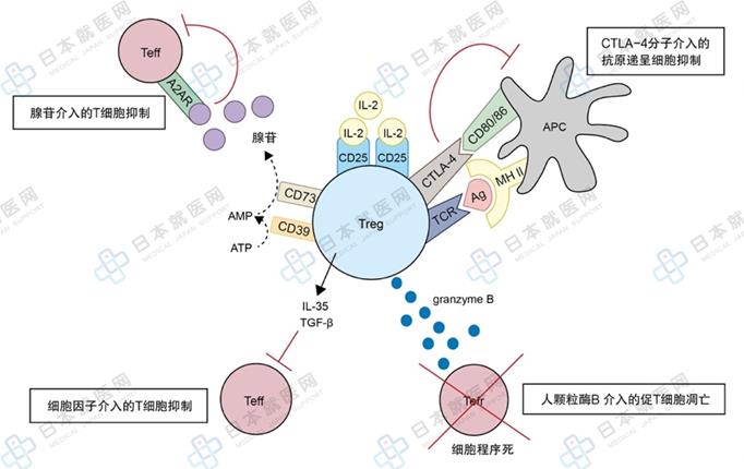 Treg細胞膜表面除了CD25陽性,還有CTLA-4、TNF受體超級家族、OX40等并存。Treg在免疫抑制中發揮的重要作用,如通過本身具備的CTLA-4抑制抗原遞程細胞(APC)。CTLA-4與抗原遞程細胞上的共刺激分子相互作用,向APC發送共刺激信號來妨礙T細胞的激活(沒有活性的T細胞不能發揮清除功能)。同時,Treg的CD25與促免疫因子IL-2親和力更強,搶先與IL-2的受體結合后,達到抑制周邊免疫應答的目的。它還能通過自身的CD39和CD73蛋白轉化細胞外的ATP(能量)通路抑制T細胞的激活。Treg自身也分泌細胞因子抑制免疫應答(如圖)。