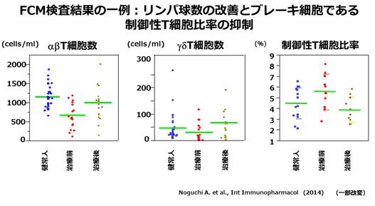 針對來瀨田治療的癌癥病人,我們?yōu)榱苏莆账麄兠庖郀顟B(tài),都會嚴格實施一套稱作“免疫功能評估”的血液檢查。通過流式細胞檢查法(FCM檢查),測定多種多樣的與免疫應(yīng)答相關(guān)的免疫細胞數(shù)據(jù),然后用我們多年的經(jīng)驗和專業(yè)的方法進行免疫功能評估,這個特殊的評估方法是通過健康人與惡性腫瘤患者的數(shù)據(jù)對比得出的,比如,直接攻擊癌細胞的殺手T細胞在腫瘤患者的絕對值低,同時協(xié)助殺手T細胞的輔助型T細胞,或者γδT細胞的絕對值也低。再比如,抑制性T細胞(Treg)是免疫應(yīng)答的剎車,直接或間接影響免疫細胞清除癌細胞的能力,而腫瘤患者的Treg水平往往更高Noguchi, A., et al. IntImmunopharmacol 18,90-97, 2014)。